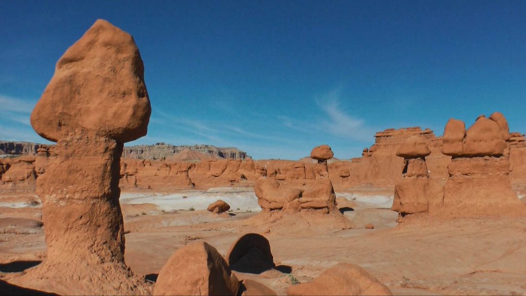 Its eminent feature is its thousands of hoodoos and hoodoo rocks, referred to locally as “goblins”, which are formations of mushroom-shaped rock pinnacles, some as high as several meters. The distinct shapes of these rocks come from an erosion-resistant layer of rock atop softer sandstone. Along with Bryce Canyon National Park some 190 miles to the southwest, Goblin Valley State Park is one location with some of the highest occurrences of hoodoos in the world.